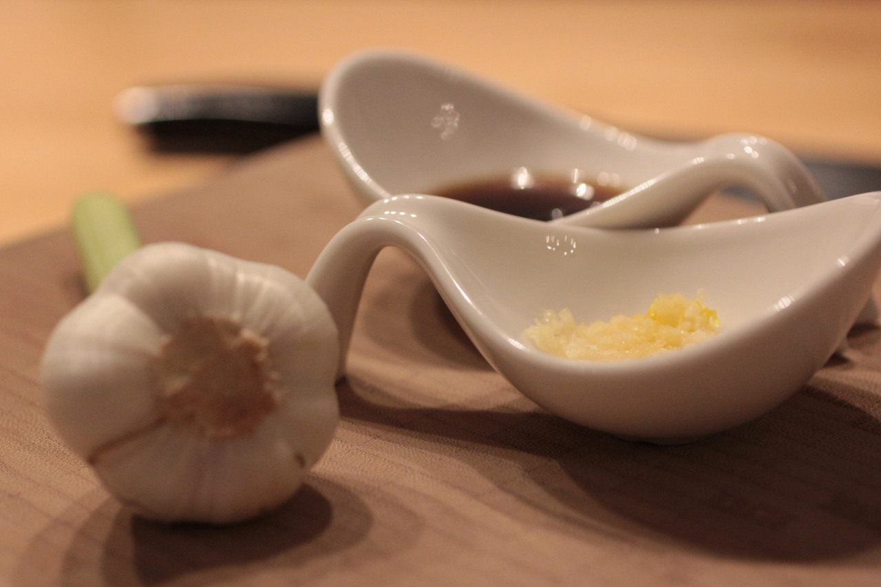 | 1 | Knoblauchzehe | | 3 EL | Öl | | 1 EL | Fischsauce |