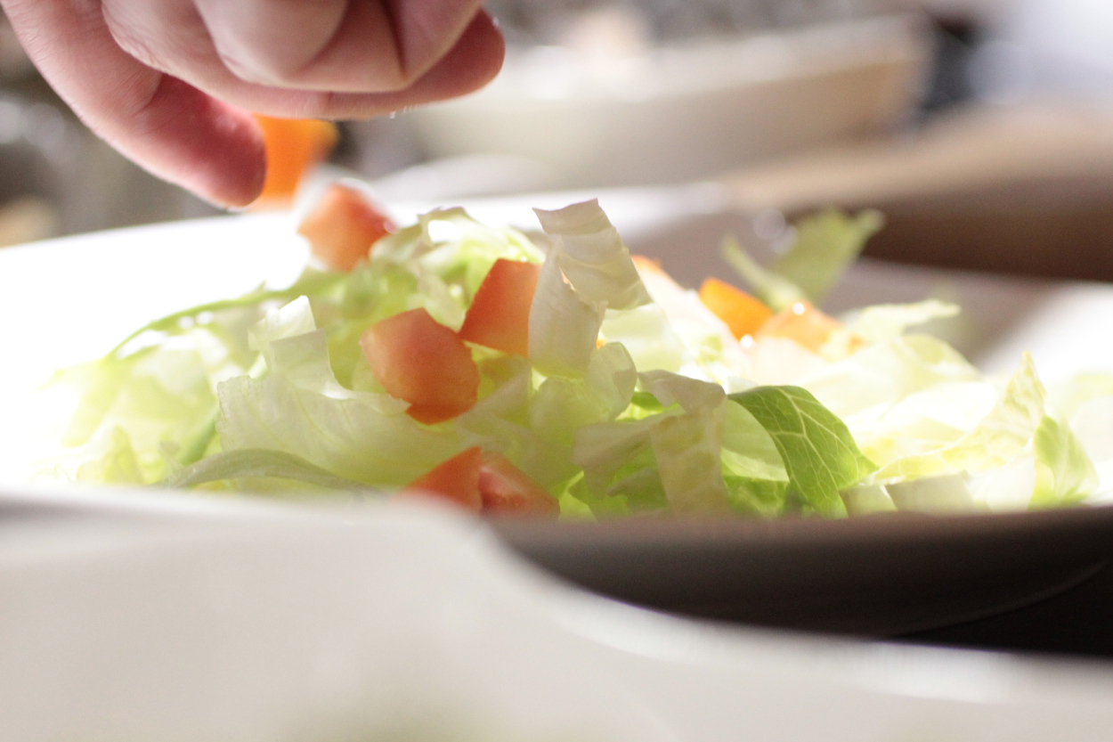 | Gewaschene, in Streifen geschnittene Salatblätter auf eine Platte geben und die in Scheiben geschnittenen Tomaten dazu garnieren. Das Rindfleisch darauf verteilen und mit gehackten Erdnüssen betreuen. |