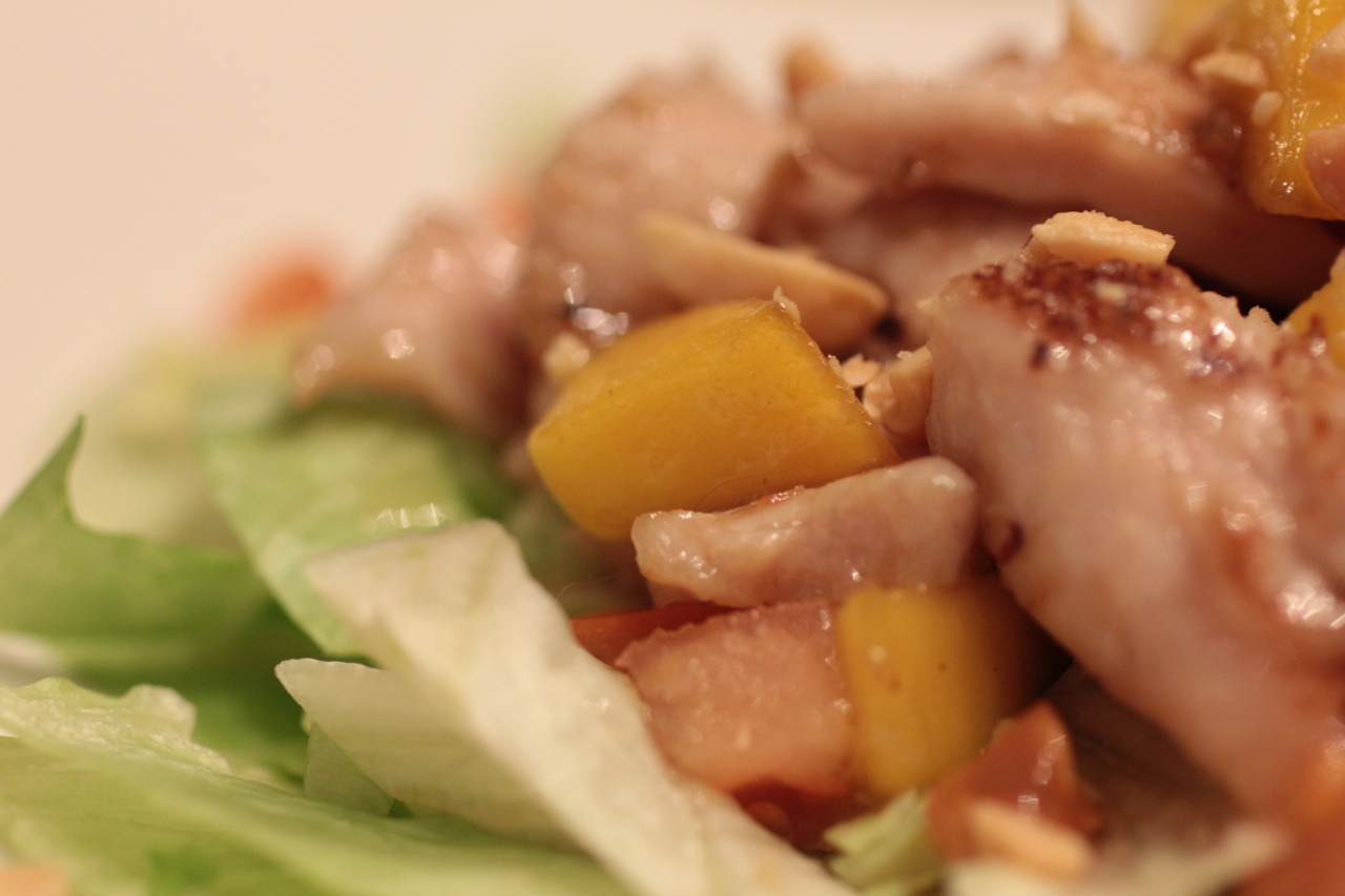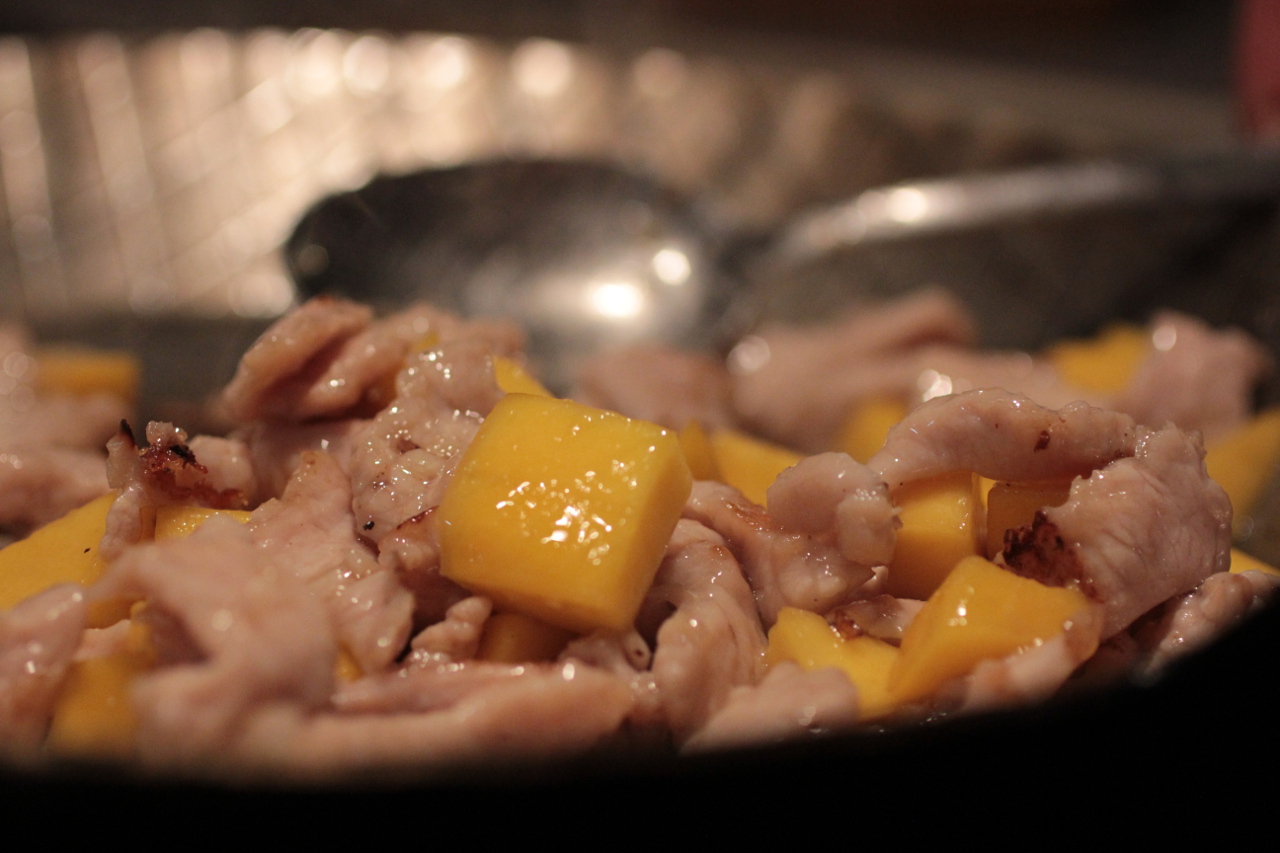 | Den Knoblauch schälen und hacken. Das Fleisch in heißem Öl kurz anbraten. Die Mangowürfel und den Knoblauch dazugeben und erwärmen. Mit Fischsauce abschmecken und vom Feuer nehmen. |